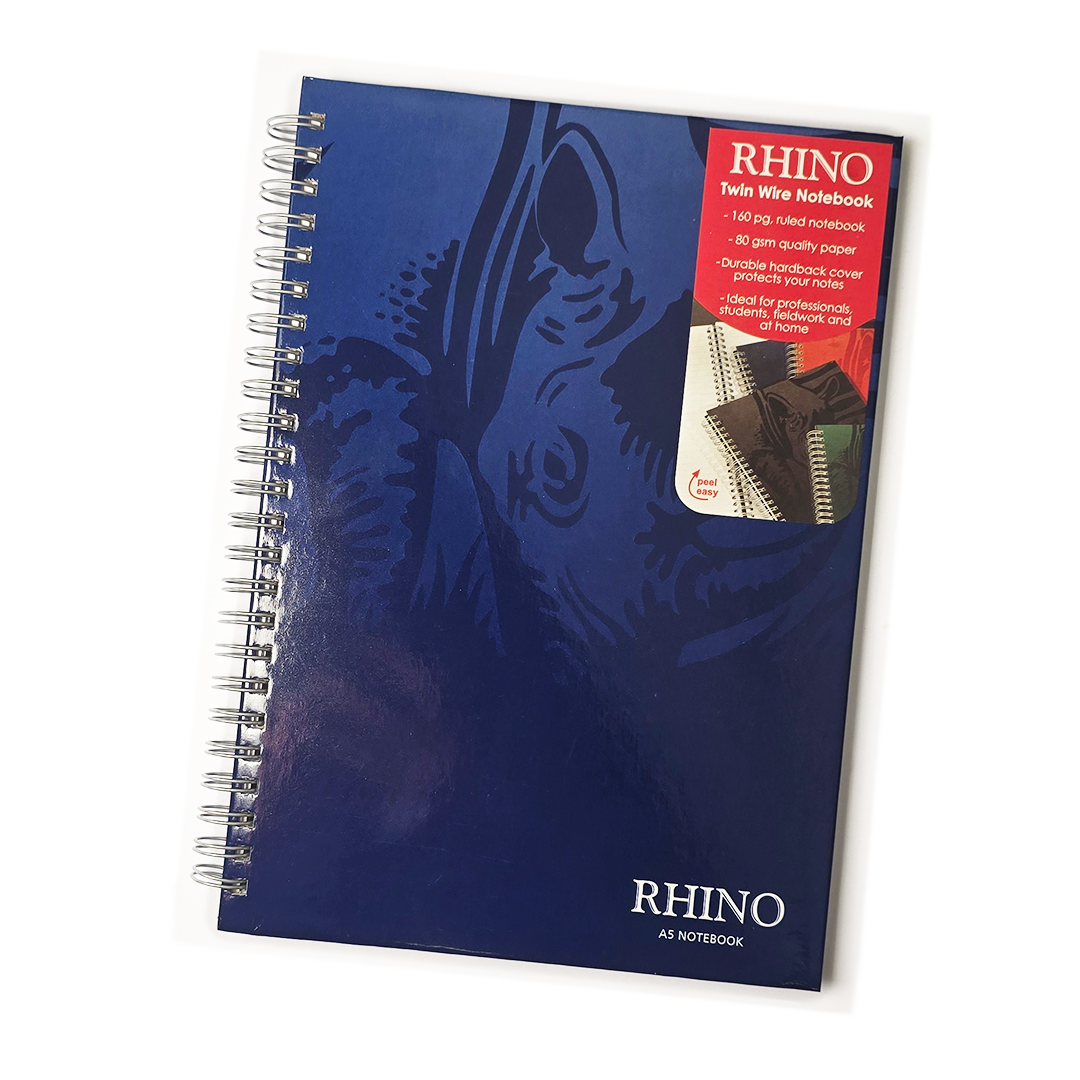 High-quality 160-page wire-bound notebook in a handy A5 size. High-quality paper with 8mm ruled feint lines - suitable for writing on both sides. Every sale helps the Save the Rhino charity.